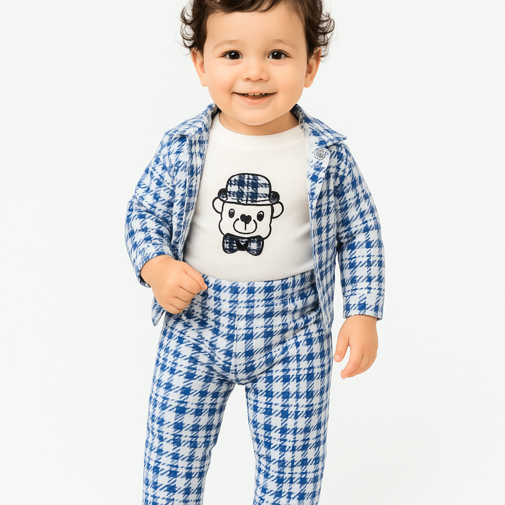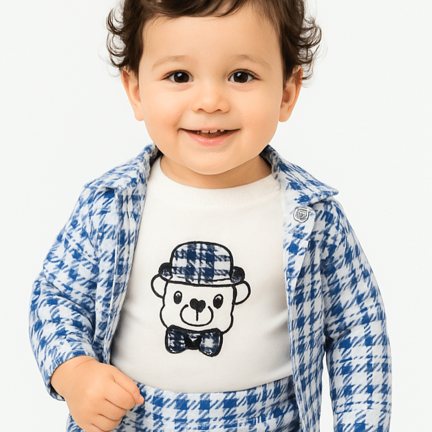 Ce magnifique ensemble pour bébé est conçu pour offrir confort et style aux tout-petits. Composé à 100% de coton, il est doux et parfait pour les peaux sensibles des bébés. L’ensemble comprend une veste élégante à carreaux avec de petites poches et un adorable body blanc imprimé d’un ourson au chapeau. Disponible en tailles 0-3 mois, 3-6 mois et 6-9 mois, cet ensemble est idéal pour toutes les saisons et fera craquer les mamans avec son design tendance et confortable.