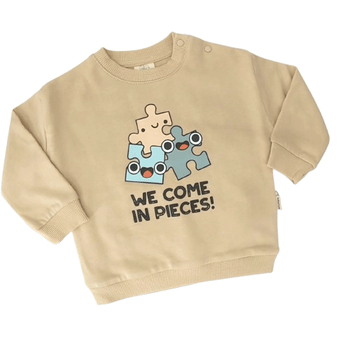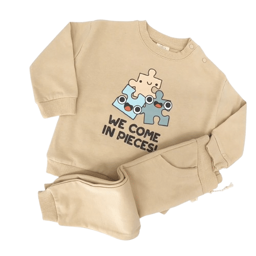 Ensemble bébé en coton bio beige, composé d’un sweatshirt imprimé puzzle « We come in pieces! » et d’un pantalon confortable. Tailles 3–24 moi.