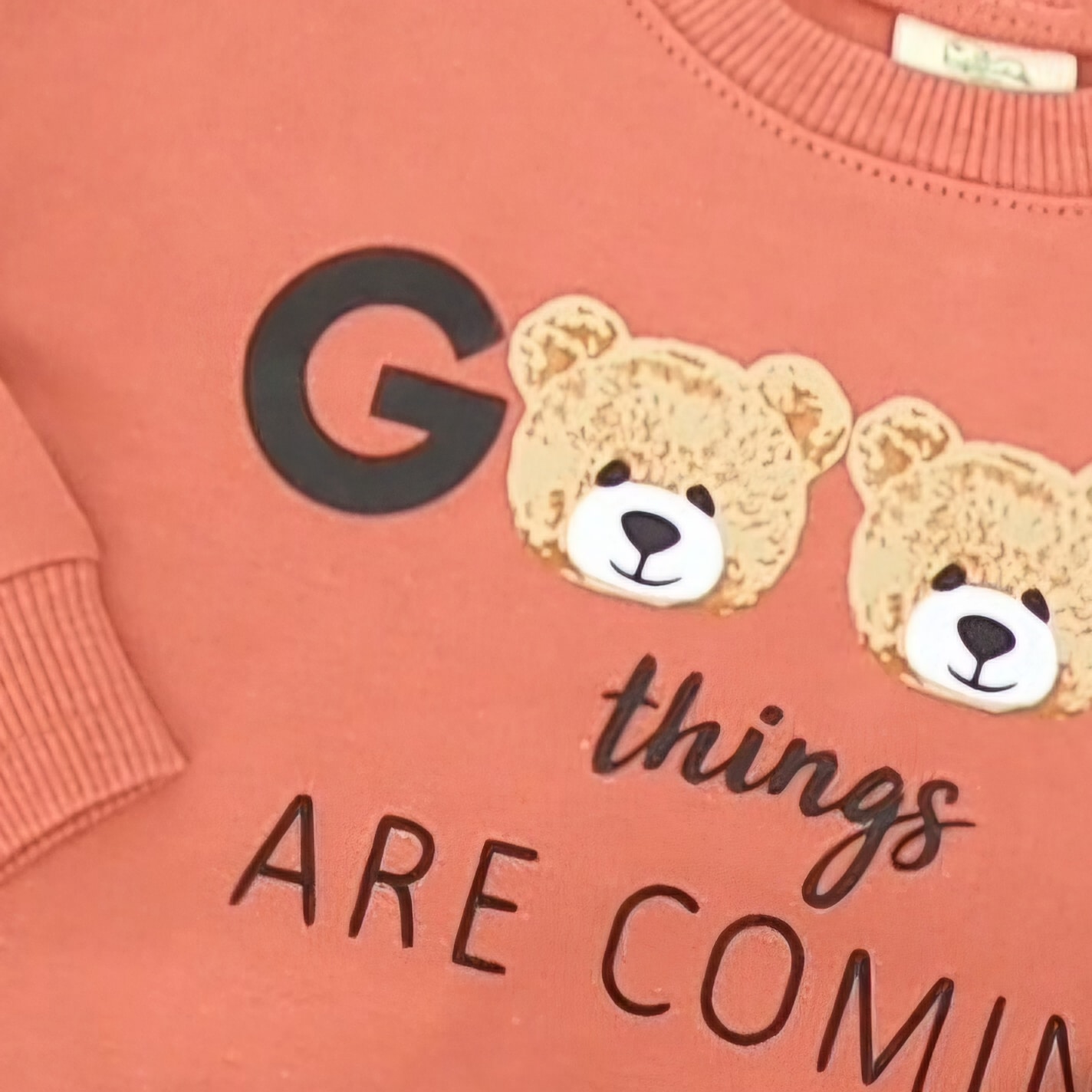 Sweat terracotta à manches longues avec pressions à l’épaule, décoré d’un motif ourson et d’une inscription positive.