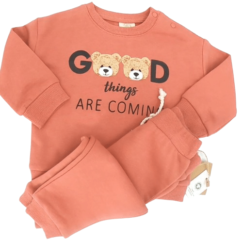 Ensemble bébé en coton bio terracotta, composé d’un sweat à motif ourson et d’un pantalon confortable. Tailles 3 à 24 mois.
