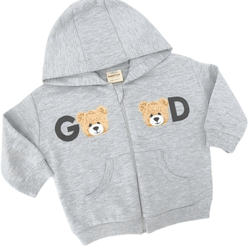Ensemble bébé coton bio, veste à capuche zippée + pantalon gris. Motif ourson et texte tendance. Tailles 3–24 mois.