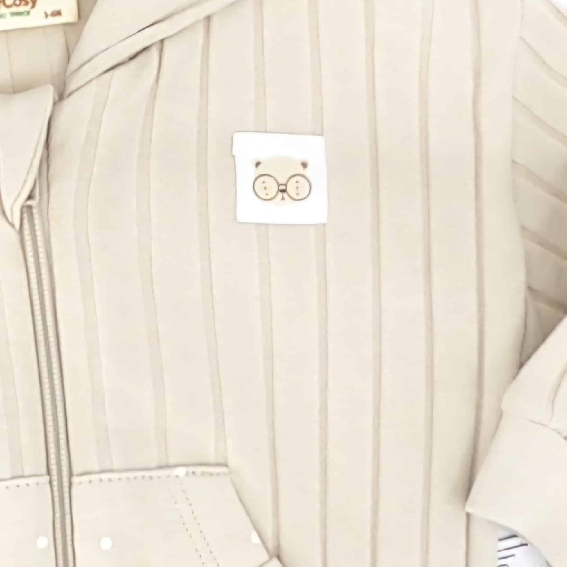Veste bébé en coton bio, douce et respirante. Coloris beige, capuche confortable, fermeture éclair et détail ourson. Tailles 3 à 24 mois.